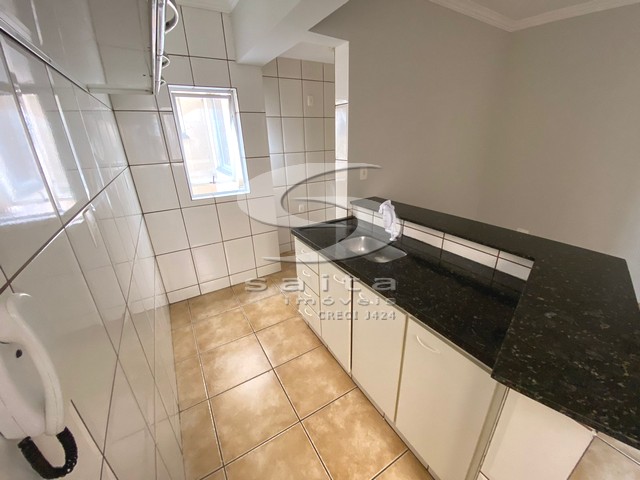 Apartamento com piso de cerâmica, cozinha tipo americana, sala, 2 quartos, 1 banheiro social, e área de serviço. 1 vaga de garagem e prédio sem elevador.