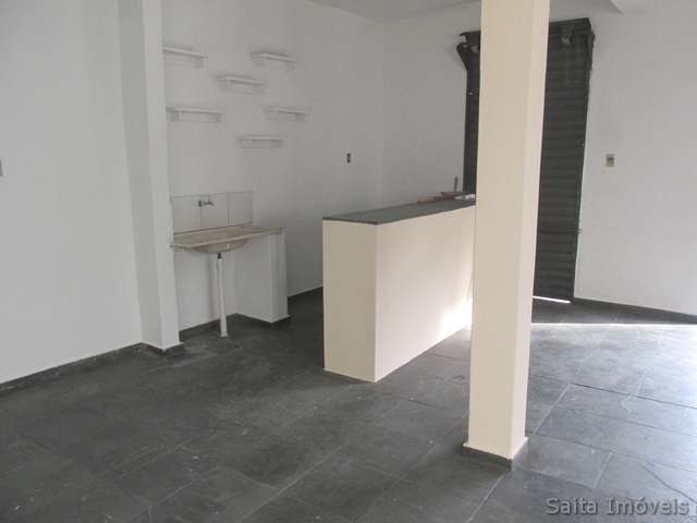 Cômodo com 3 portas de aço, piso de ardósia, 1 banheiro e 1 pia, aprox 40 m²